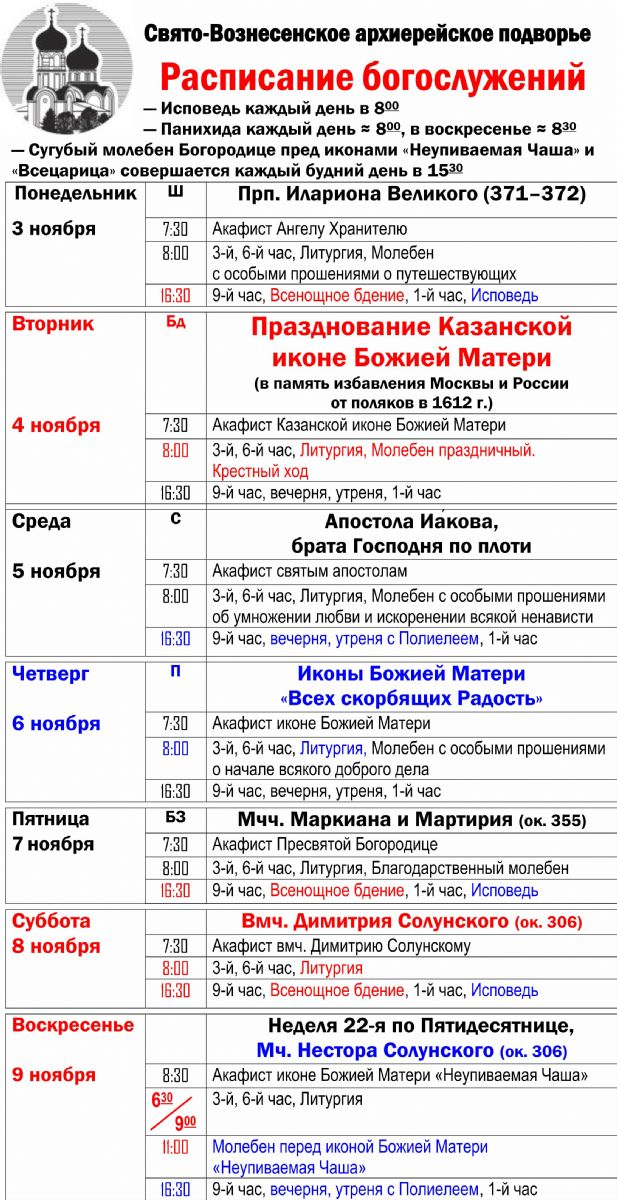 Расписание богослужений с 3 по 9 ноября 2025 года: